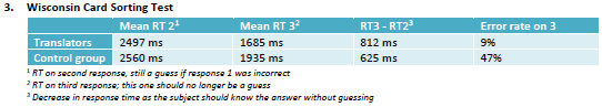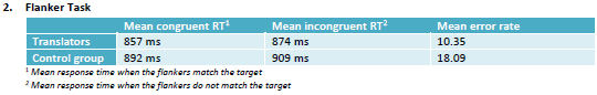 In this task, in which the translators were not hampered by textual interference, they were faster under both conditions with a significantly lower error rate than the control group, suggesting more effective inhibitory control.